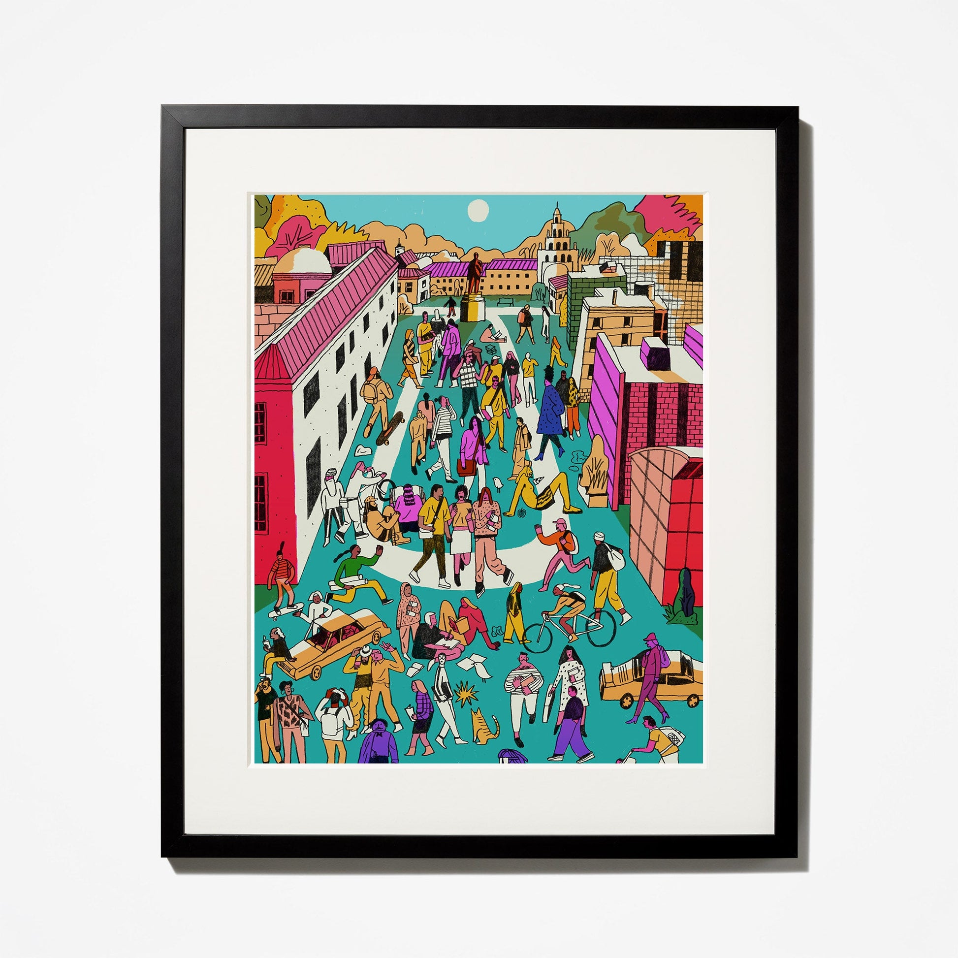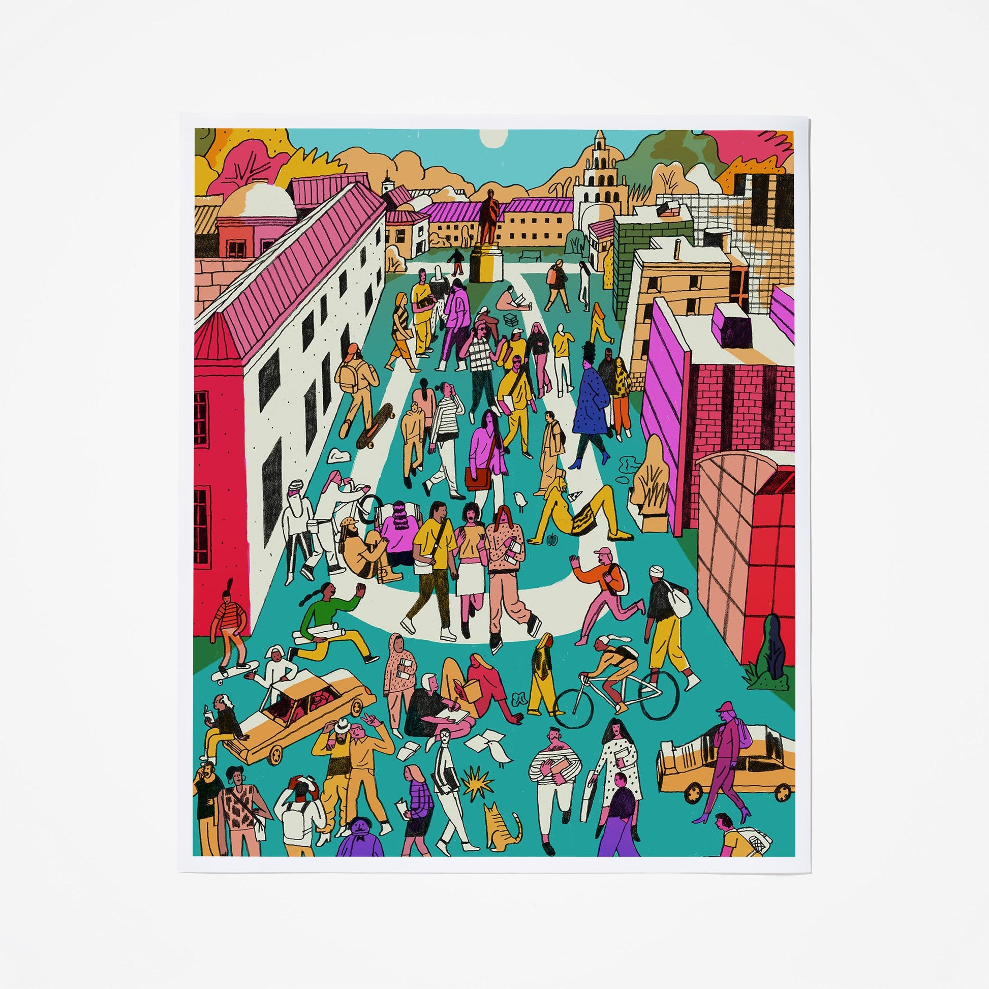 Josh Cochran’s colorful illustration, depicting modern campus life, accompanied the Education article, “With Changing Students and Times, Colleges Are Going Back to School,” published April 5, 2018, in The Times. The image is part of our collection of editorial illustrations being offered for the first time ever to the public as unframed or framed fine-art prints.