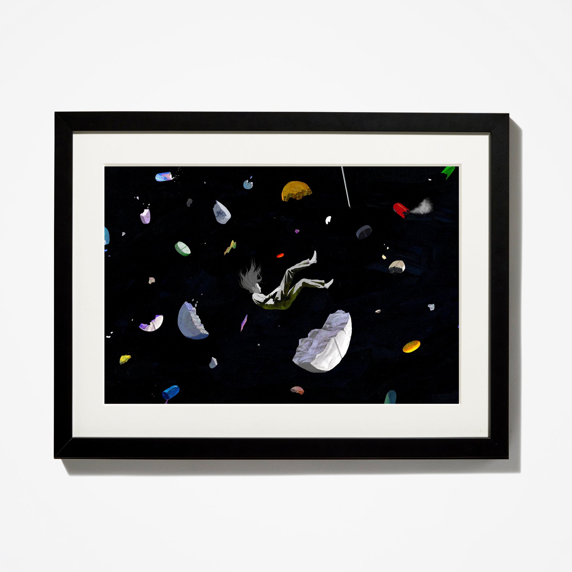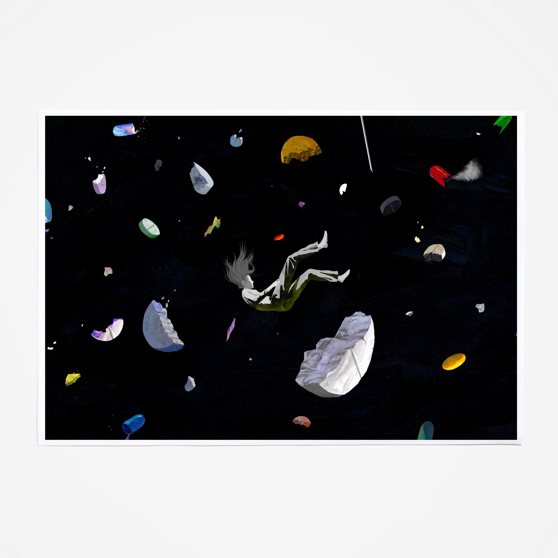 A woman falling into addiction in an endless universe of drugs is captured in this haunting illustration that appeared with The Times Opinion article, “‘I Am Going to Die if I Keep Living the Way I Am.’ She Was Right,” published July 20, 2018. The image is part of our collection of editorial illustrations being offered for the first time ever to the public as unframed or framed fine-art prints.