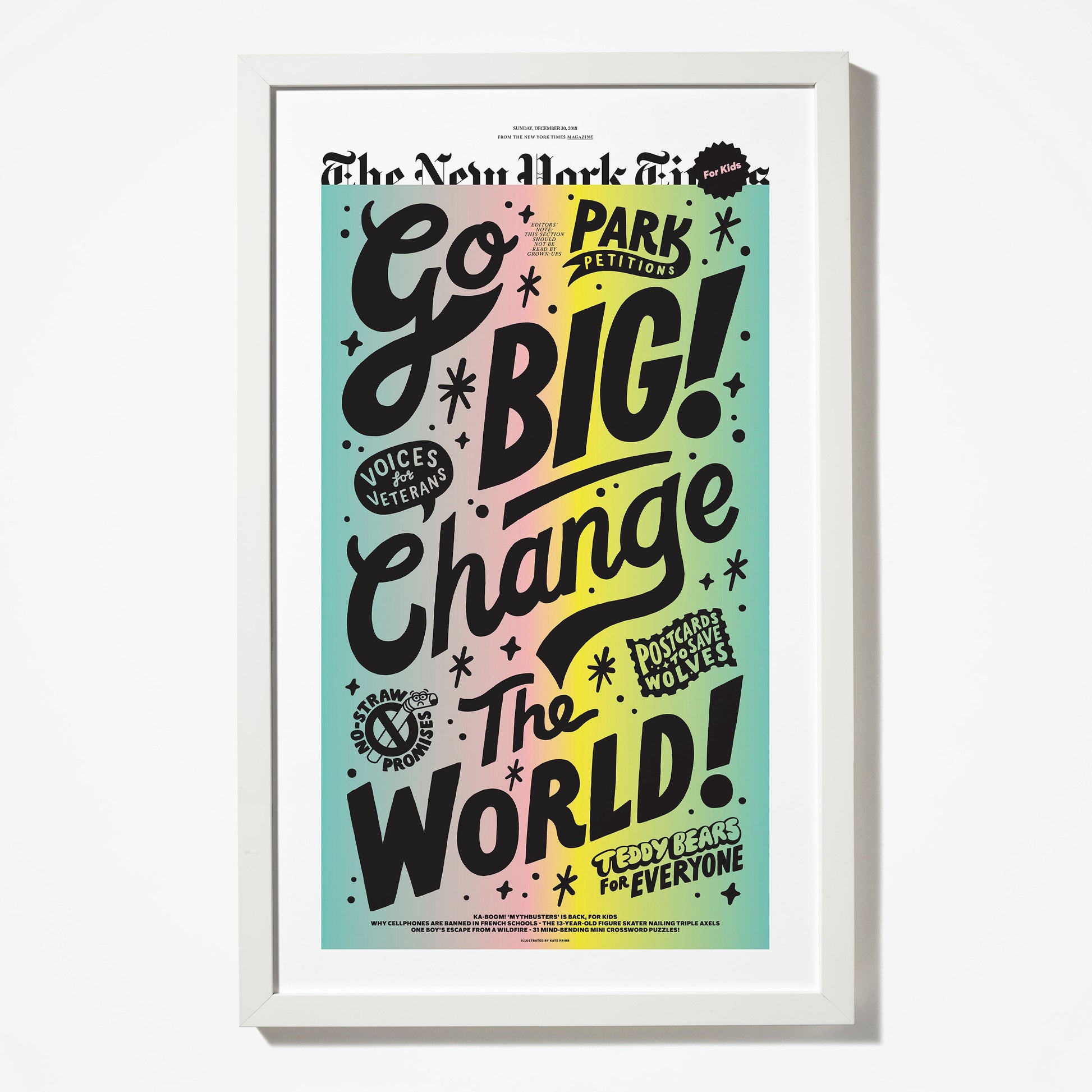 Curious readers start young: For the first time, get one of the New York Times for Kids' broadsheet covers as a colorful full-size, framed print. Each one celebrates the curiosities, imaginations and passions of kids with visual wit. From climate change to dinosaurs, collect them all! This beautifully-designed cover, “Go Big! Change the World,” was published in December 2018 and was illustrated by Kate Prior.