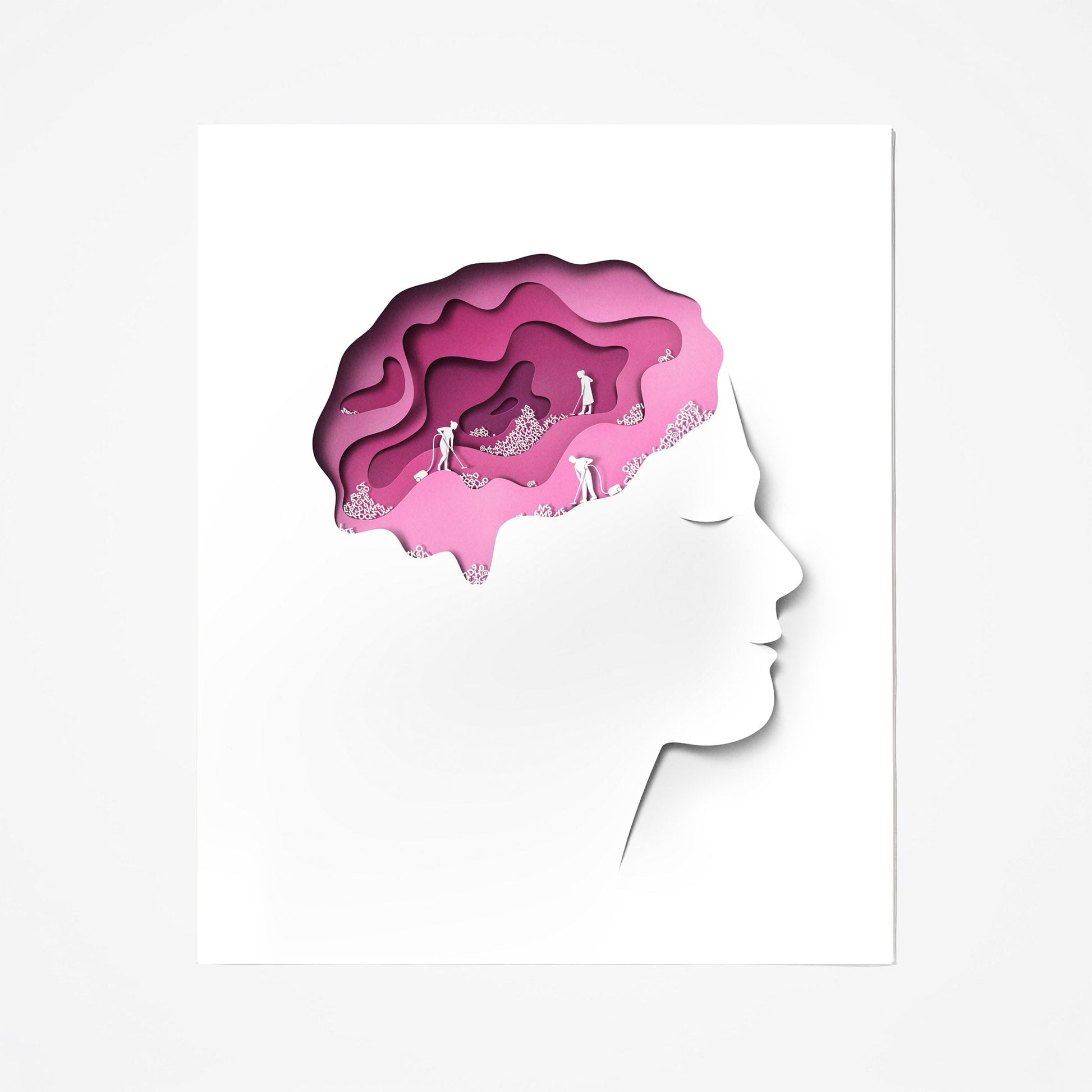Aptly showing the insides of one's head, this illustration accompanied “Goodnight. Sleep Clean,” a Times Opinion article about the brain playing the part of mental janitor during sleep. Published January 11, 2014, the article detailed how the brain clears out “all of the junk that has accumulated as a result of your daily thinking.” The image is part of our collection of editorial illustrations being offered for the first time ever to the public as unframed or framed fine-art prints.