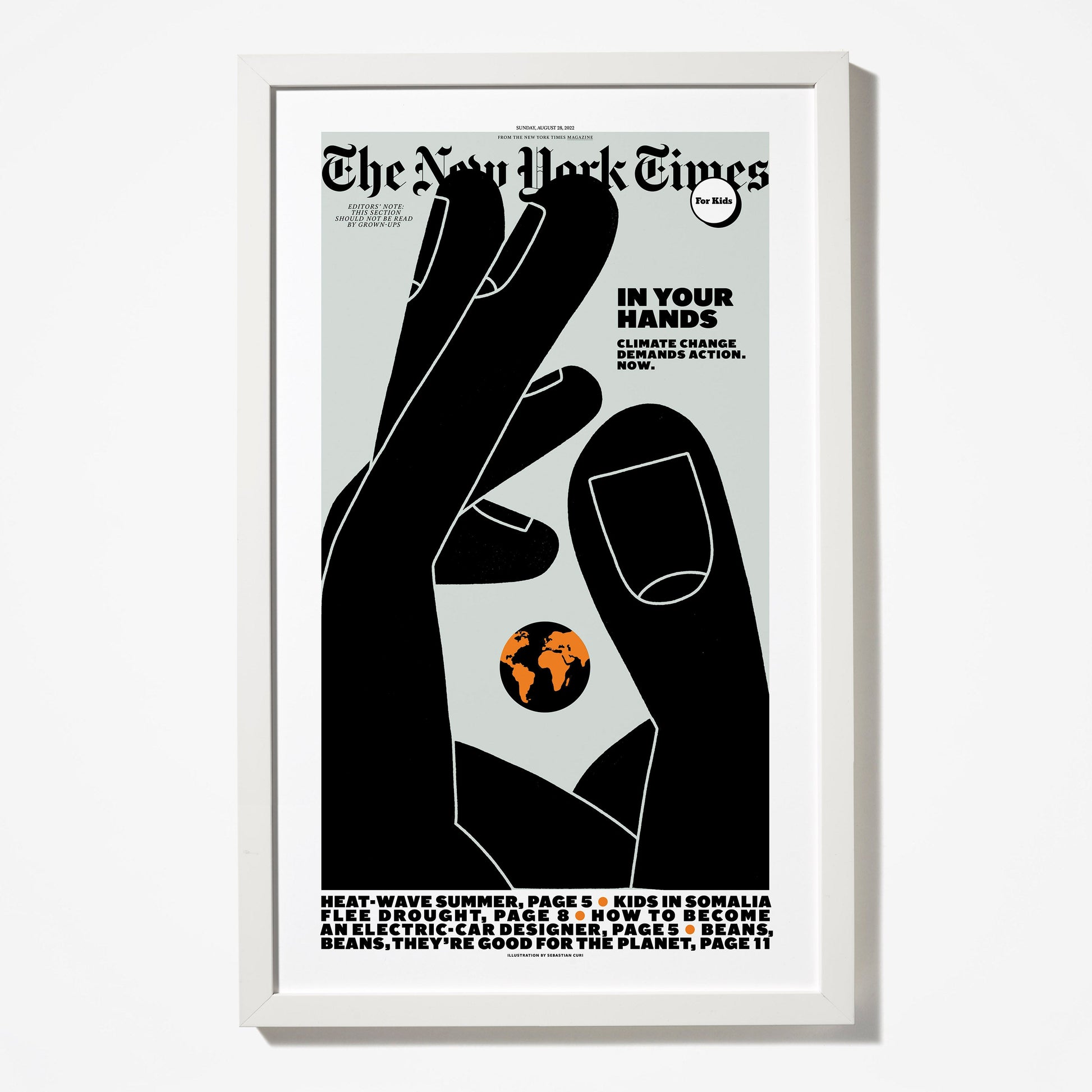 Curious readers start young: For the first time, get one of the New York Times for Kids' broadsheet covers as a colorful poster-size, framed print. Each one celebrates the curiosities, imaginations and passions of kids with visual wit. From climate change to dinosaurs, collect them all! This beautifully-designed cover, “In Your Hands,” was published in May 2022 and was illustrated by Sebastian Curi.