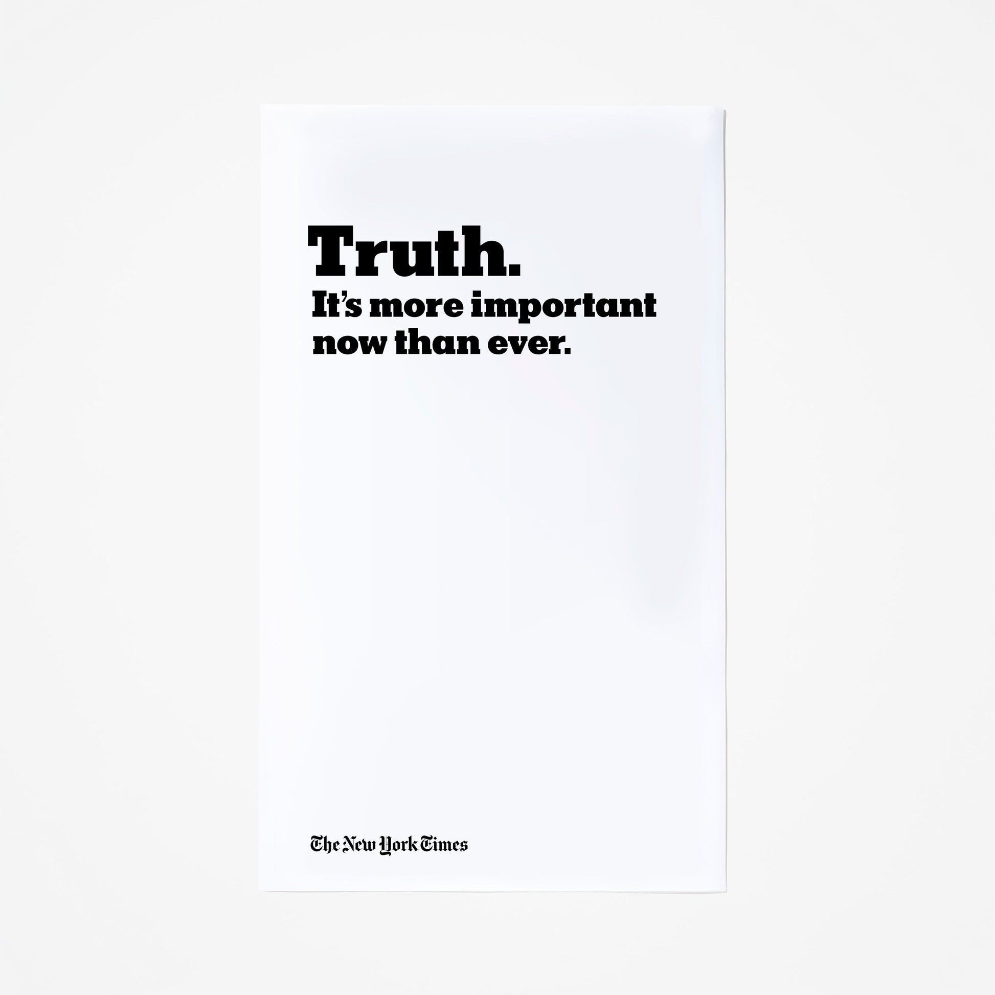 This New York Times poster is inspired by the newspaper's first brand campaign in a decade. The poster is a reprint of a page that appeared in The Times on Feb. 26, 2017, displaying the words, Truth. It's more important now than ever.
