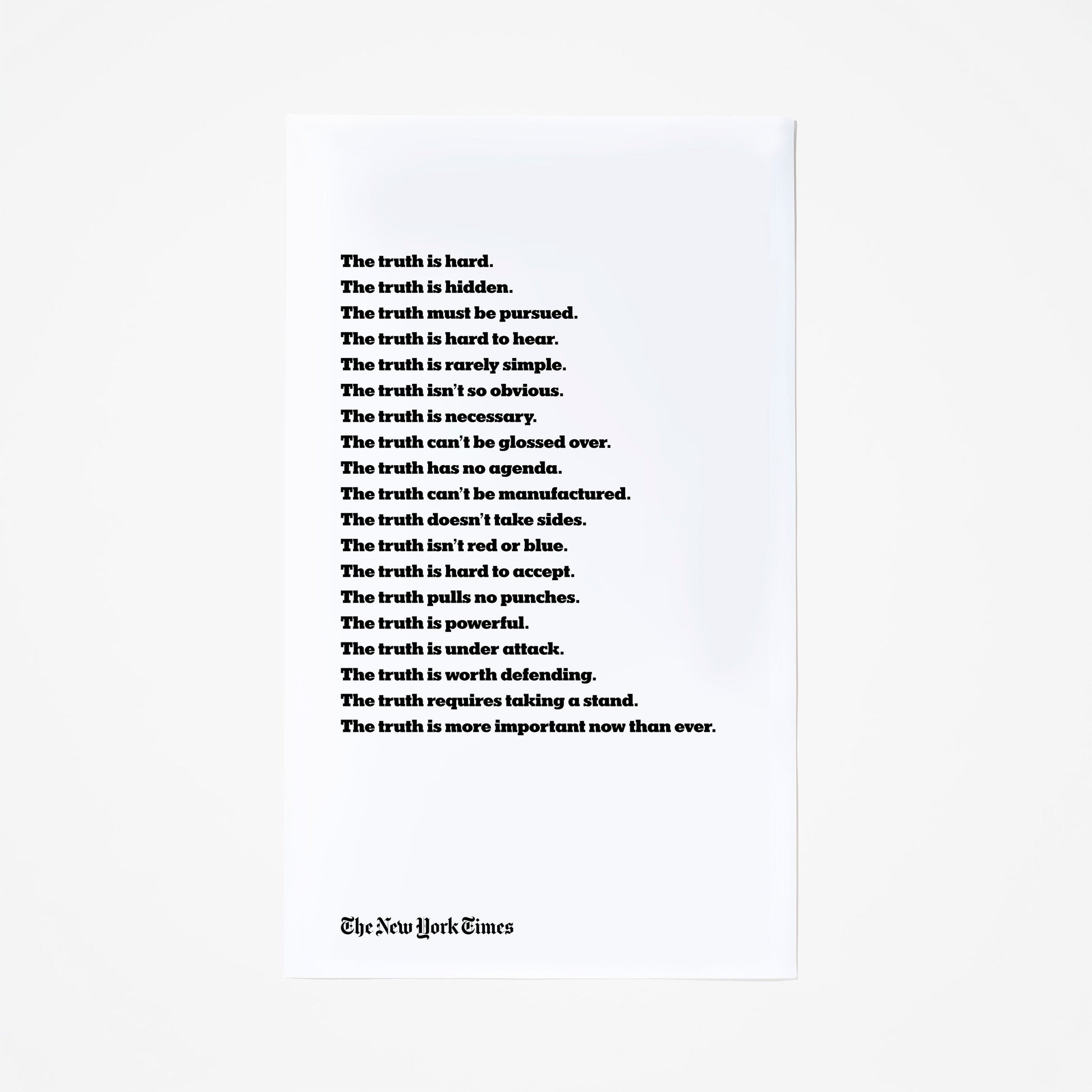 This New York Times poster is inspired by the newspaper's first brand campaign in a decade. The poster is a reprint of a page that appeared in The Times on Feb. 26, 2017. It starts with the words The truth is hard and ends with The truth is more important now than ever.