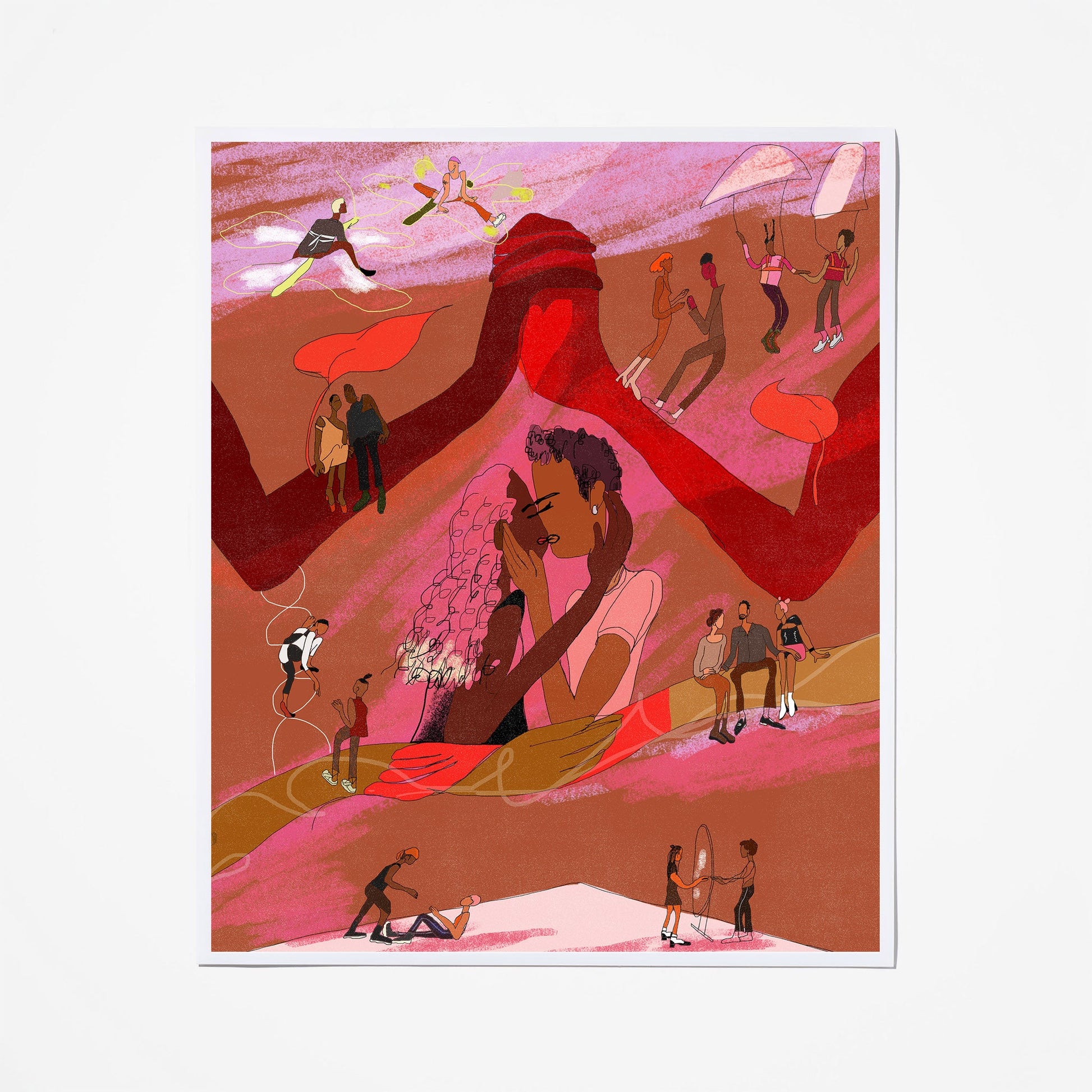 During the month of February in 2022, two popular New York Times series, “Modern Love” and “Black History, Continued” came together to present a selection of responses to the question “What is Black love today?” The eight published responses “illuminate how Black people live, and love, in this moment.” This compelling illustration by Hannah Buckman accompanied Veronica Chambers’ introduction to the series. Chambers writes, “Every Black love story — like every love story — is a journey into uncharted territory, making us explorers and lovers at the same time.”